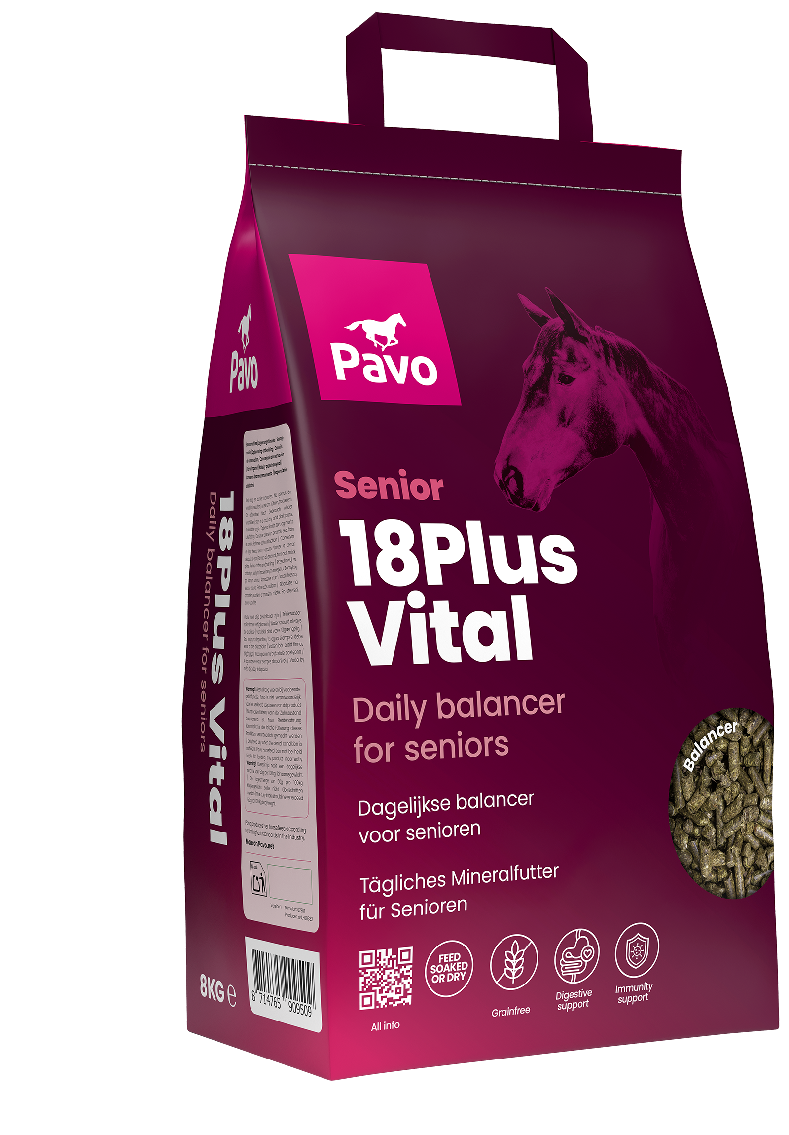 Pavo 18Plus Vital ist ein Vitamin- und Mineralfutter, der speziell für ältere Pferde entwickelt wurde. Er enthält alle wichtigen Vitamine und Mineralstoffe, ist dabei sehr zucker- und stärkearm und unterstützt zusätzlich Immunsystem und Verdauung. So kannst du deinen Senior fit und vital halten.