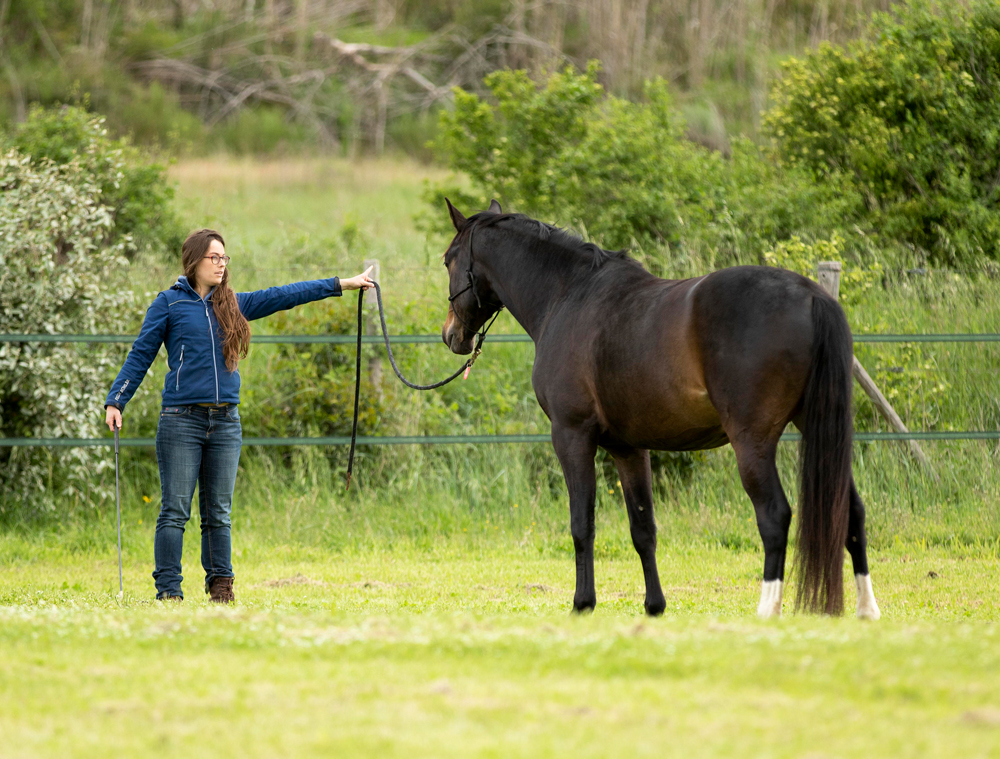 „Zum Beispiel mit Bodenarbeit. So bleibst du aktiv mit deinem Pferd beschäftigt und es nutzt weiterhin seine Muskulatur. Wechsle dabei auch die Umgebung: nicht nur Reitplatz, sondern auch Wiese oder Wald.“