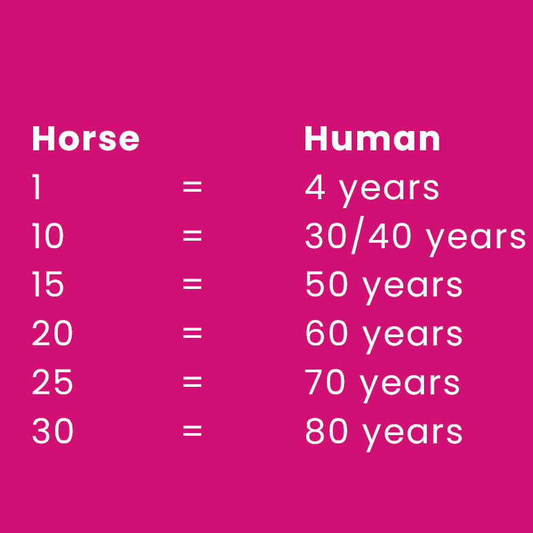 Sabe realmente qual é a idade do seu cavalo em relação aos anos humanos? Pode encontrar uma comparação no quadro abaixo:
