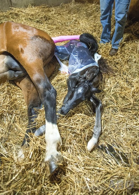 Erst kommen die Vorderbeine, dann der Kopf. Beim breiteren Rippenbogen des Fohlens muss sich die Stute beim Pressen einmal sehr anstrengen. Ist das geschafft, verläuft die restliche Geburt ruhig ab. Wenn die Hinterbeine noch eine Weile im Geburtskanal der Stute verweilen, ist das kein Problem. Achte nur darauf, dass die Nase des Fohlens von keiner Schleimhaut bedeckt ist. Falls doch, entferne diese so schnell wie möglich.