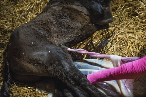 Wenn die Fruchtblase geplatzt ist und die Stute sich hinlegt, sind die ersten kleinen Fohlenhufe oft bereits nach wenigen Minuten sichtbar. Sollte dieser Vorgang länger als 10 bis 15 Minuten dauern, gehe mit der Hand in den Geburtskanal und prüfe, ob du die Hufe fühlen kannst. Bitte vergiss nicht, vorher deine Hände zu waschen. Wenn möglich, versuche vorsichtig die Beine in die richtige Richtung zu bewegen. Du hast Zweifel oder traust dir diese Aufgabe nicht zu? Rufe dann immer direkt deinen Tierarzt an. Erkläre ihm genau, in welcher Situation sich deine Stute aktuell befindet, bzw. was du im Geburtskanal fühlen konntest.