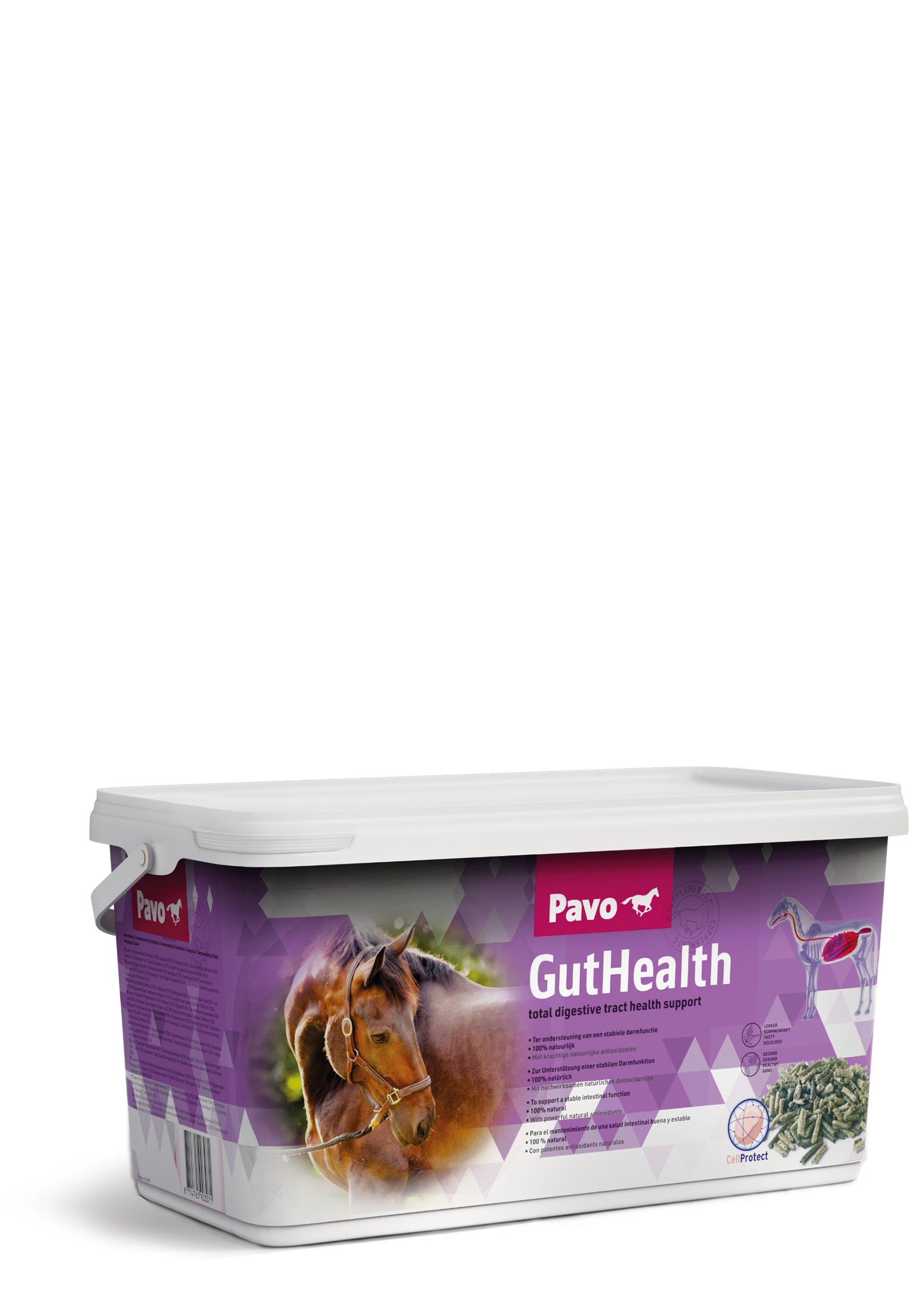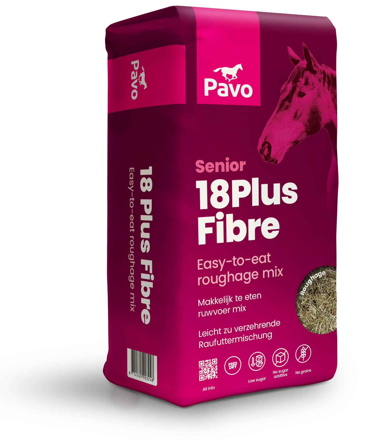 As mentioned in the previous paragraph, good dental function is essential for a healthy digestion. Poor chewing can lead to problems such as manure water, loose stools, colic, diarrhoea or obstruction. Pavo GutHealth has been specially developed to support your horse’s digestion by restoring balance to the gut microflora and can be used for senior horses that struggle with digestive sensitivities. The 18Plus Sensitive could also be considered to support your senior and it’s gut health. This complete feed is designed to meet the specific nutritional needs of older (sensitive) horses, but also supplies additional support for digestion when fed at the full recommended amount.