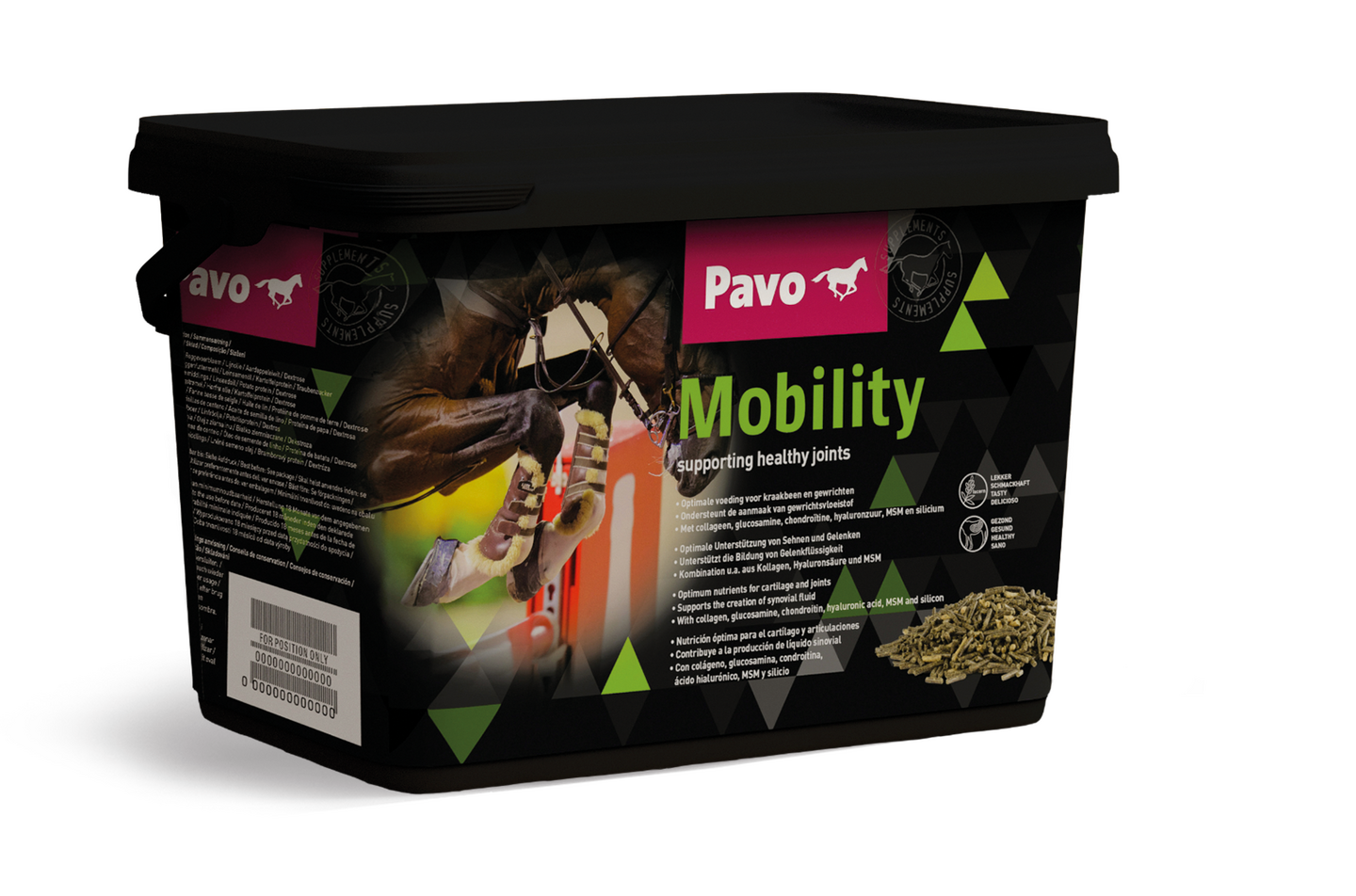 Pavo Mobility offers joint support by an extensive mix of powerful ingredients and can be of great benefit for senior horses. This supplement contains well-known and proven ingredients like glucosamine and hyaluronic aid, components for healthy joint fluid. Cartilage strength and elasticity is maintained with the help of chondroitin and MSM (sulphur). In addition, vitamine C and the micro-mineral sillicon play crucial roles in the formation of bone tissue, cartilage, collagen and hyaluronic acid. However, the most powerful ingredient of Pavo Mobility is collagen. This outstanding ingredient effectively supports connective tissue, bone and cartilage. All in all, Pavo Mobility offer extensive and powerful support to the joints.